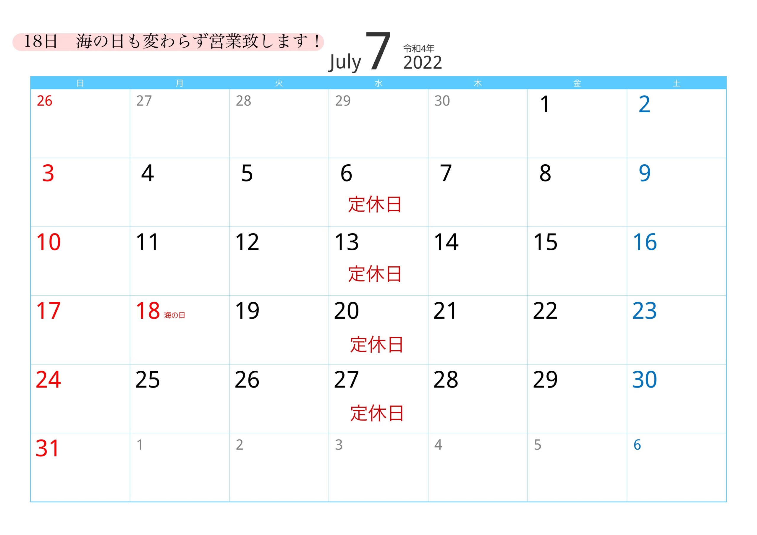 ☆7月休業日のご案内☆